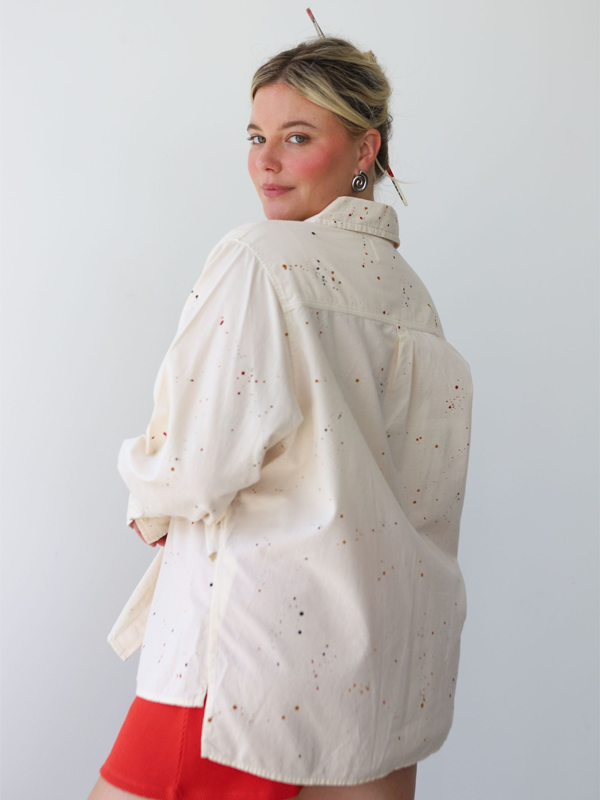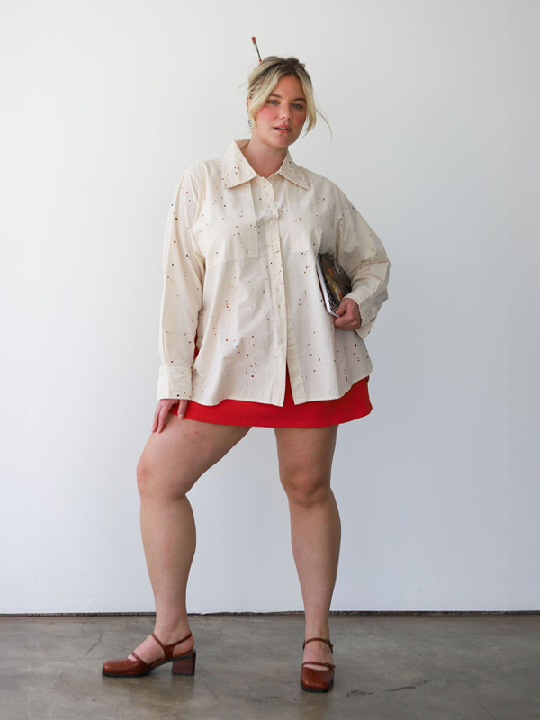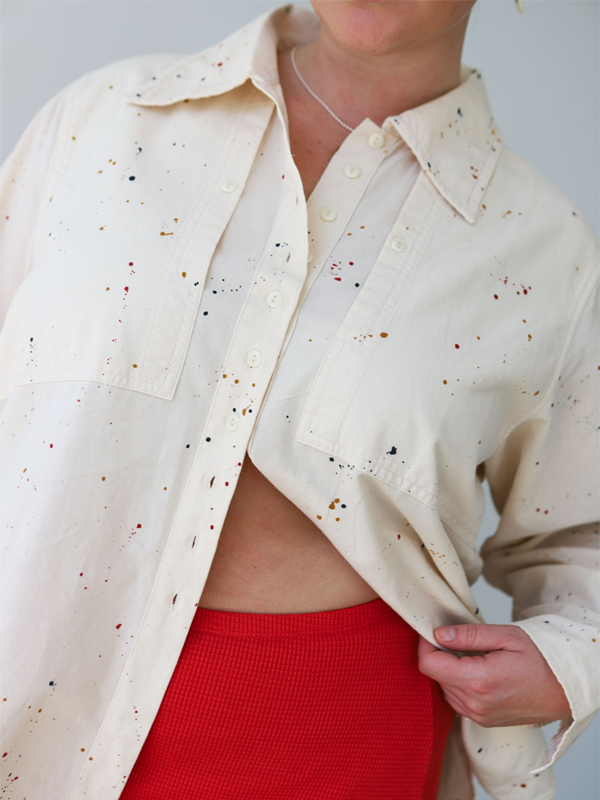 ✦ Features 2 sexy slits on the side for breathability, 9 petite coconut buttons on the front for a feminine touch, and 2 oversized chest pockets to slide all your ish in.