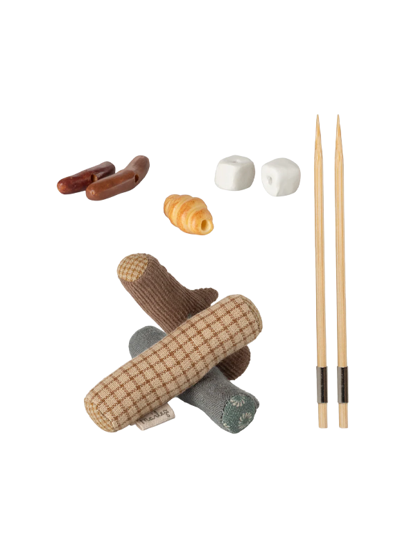 This miniature bonfire set includes sticks, food, and logs. The sticks have a small metal part so the hiking mice can hold the sticks with their magnet paws!