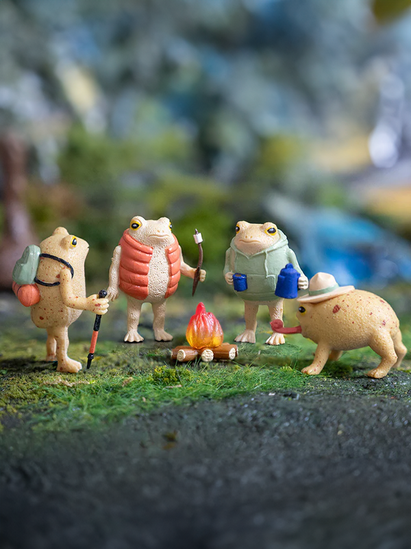 ⦠Box of 4 camping frog figurines featuring four different styles.