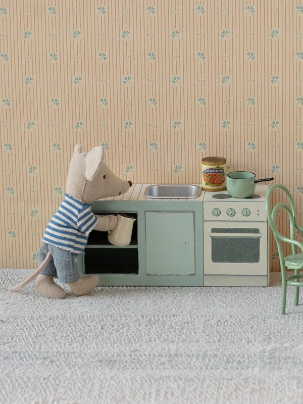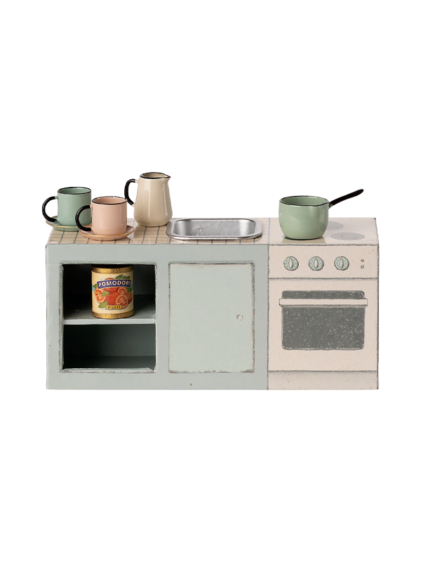 This small kitchen counter comes with 2 cups and 2 plates, a pot, a pitcher, and a small tomato can. The sink is made of metal to look as real as possible!