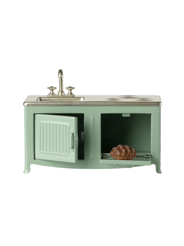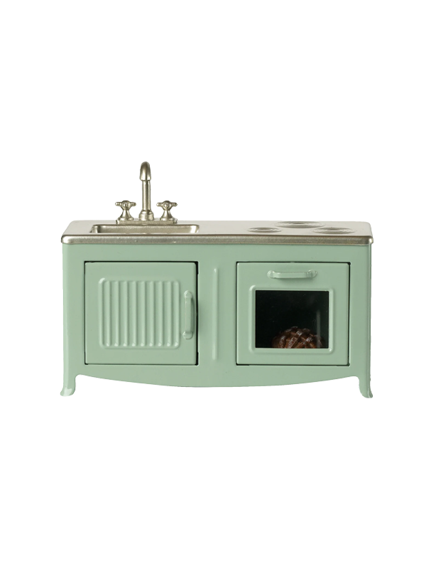This small metal kitchen is a beautiful mint color and includes a cabinet door, sink, and even an oven with a freshly baked pie!