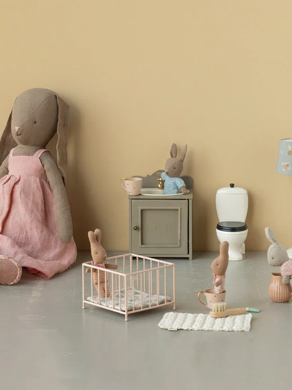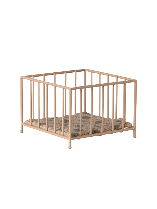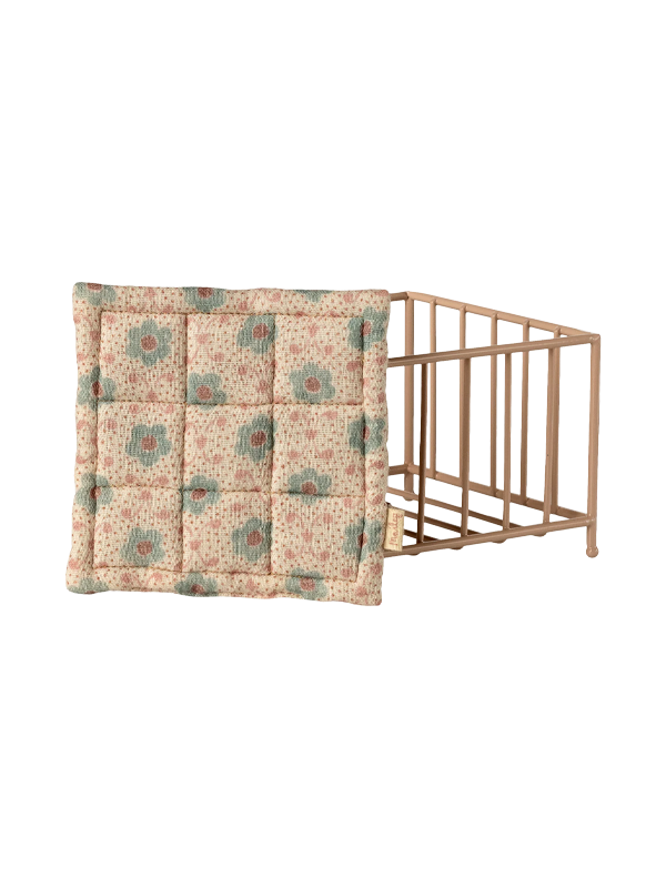 This miniature playpen is made of metal and features a soft mattress covered in unique Maileg fabric.