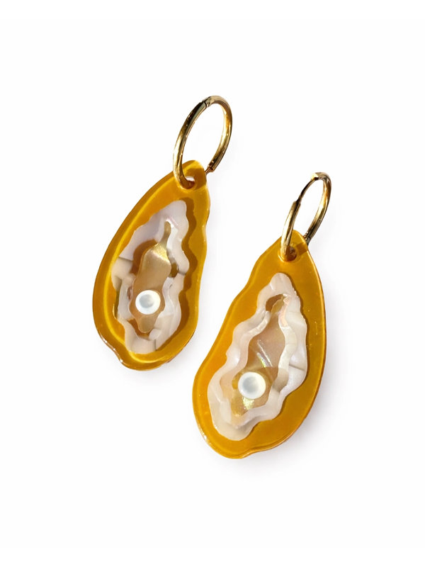 Layered acetate with pearlescent cabochon detail at center, hung on 16mm gold-plated hinged hoops for secure, comfortable wear.