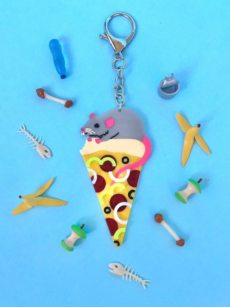 He's been holding on to this slice of pizza with all his might and is prepared to do the same for your keys! šš